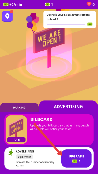 1、進入游戲,可對沙龍廣告牌進行升級,點擊UPGRADE按鈕,花費相應金錢提升廣告牌等級,以此吸引更多客人。