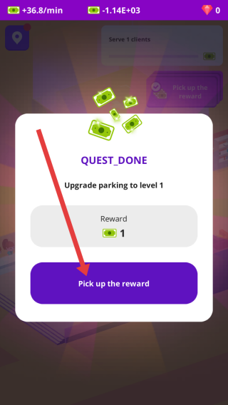 3、完成如升級停車場等任務后,會彈出任務完成界面,點擊Pickupthereward按鈕,領取相應的金錢獎勵。