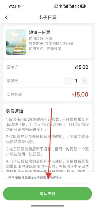 4、在電子日票購買頁面確認票張數與實付金額閱讀購買須知,了解使用次數、有效期及退改規則,點擊確認支付,完成日票購買。