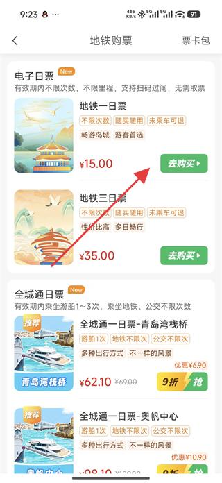 3、進入地鐵購票頁面選擇電子日票的地鐵一日票了解其價格與使用規則,點擊去購買,進入日票購買流程,提升地鐵出行的便利性。