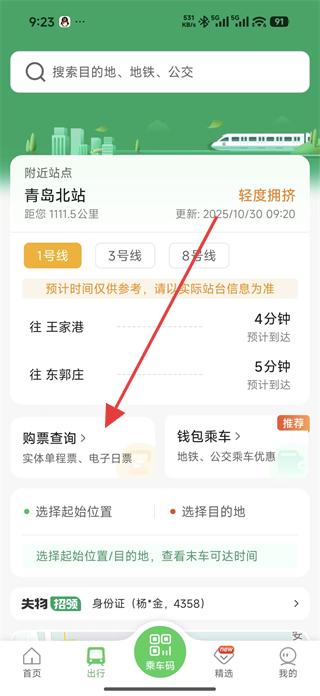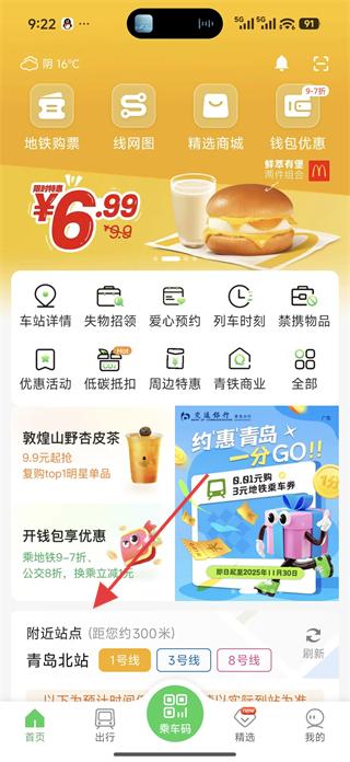 1、進入軟件首頁查看附近站點青島北站,了解其距離與地鐵線路,同時可使用地鐵購票、線網圖等功能,開啟地鐵出行服務體驗。