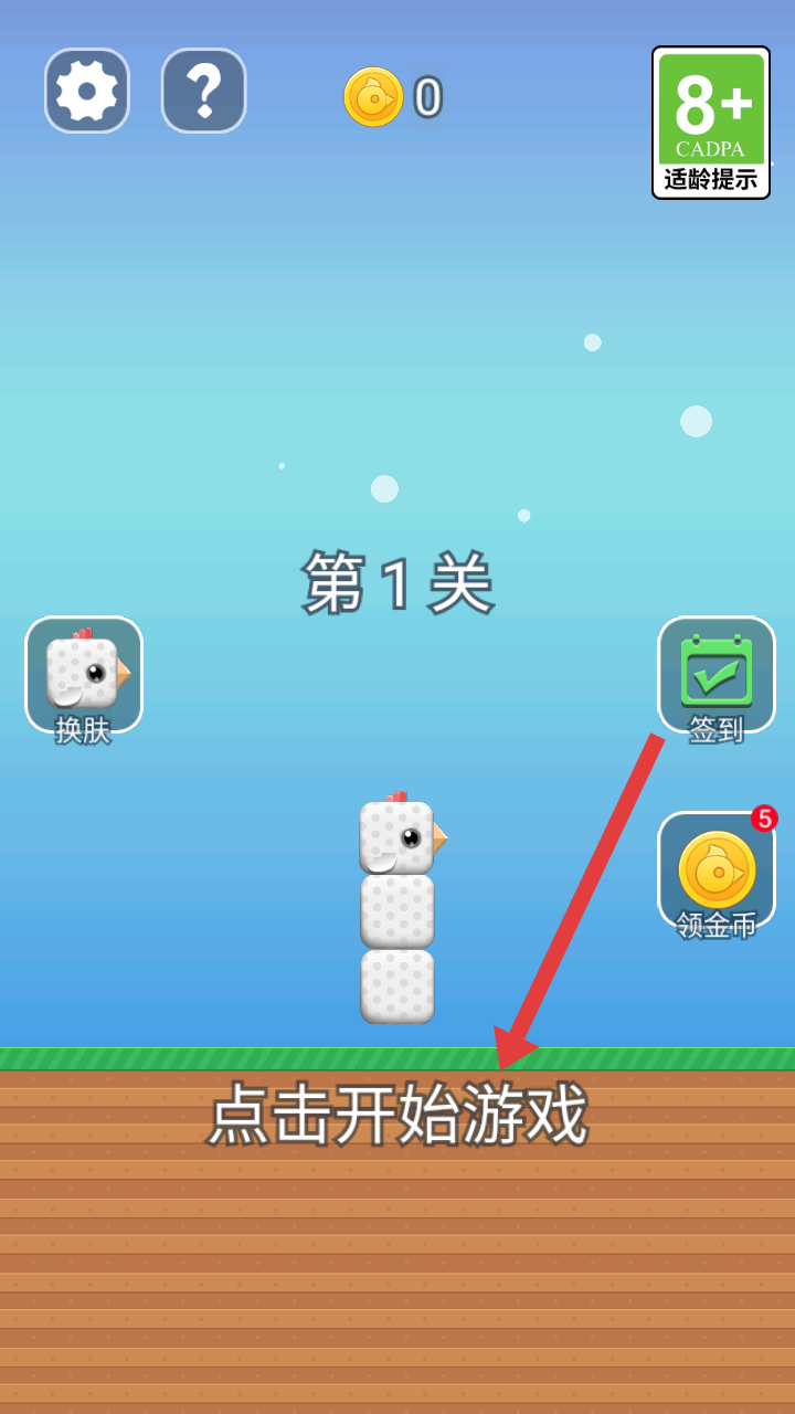 1、進入游戲第1關界面,可看到換膚、簽到等功能按鈕,點擊開始游戲,開啟方塊小鳥的闖關之旅。