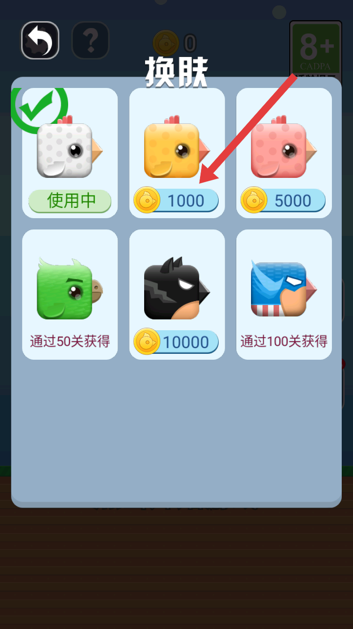 2、換膚界面,有多種小鳥皮膚可選,部分皮膚可用金幣購買,比如花費1000金幣可解鎖金色小鳥皮膚。