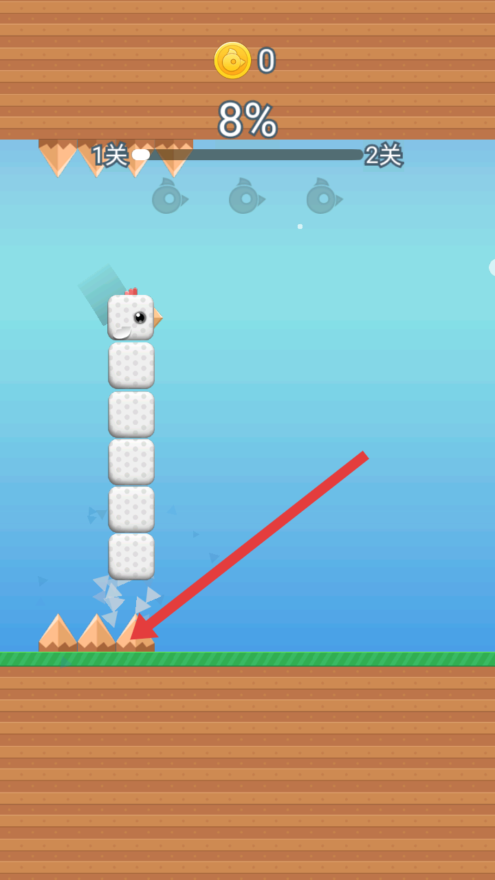 3、闖關時,操控方塊小鳥移動,要避開下方的尖刺障礙物,若碰到尖刺小鳥會受損,影響闖關進度。