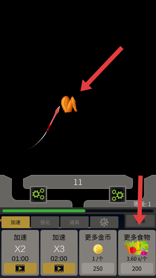 2、進入游戲后,通過滑動讓小劍朝著食物等目標飛去,精準切割目標,同時,可留意下方功能按鈕,比如升級,為后續提升做準備。