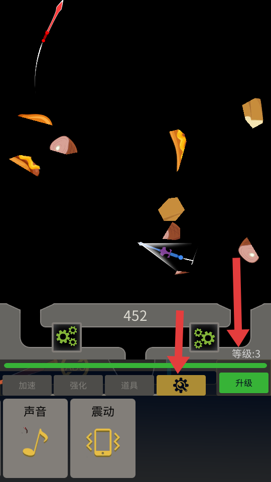 4、隨著游戲推進,等級提升,可點擊設置按鈕,調整聲音、震動等設置,優化游戲體驗,也可點擊升級,強化小劍等,提升切割能力。