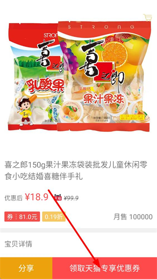 3、進入商品詳情頁能看到商品介紹價格及月售數據,點擊領取天貓專享優惠券,可獲取對應優惠,還能進行分享操作。