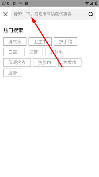 4、搜索頁面可輸入內容查找隱藏優惠券,下方顯示熱門搜索詞條,包含日用品等品類,便于快速找到所需優惠商品。