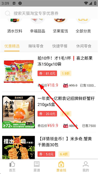 2、惠省錢頁面展示多款優惠商品,如喜之郎果凍等,顯示券后價優惠力度及銷量,點擊商品可進入詳情頁查看更多信息。
