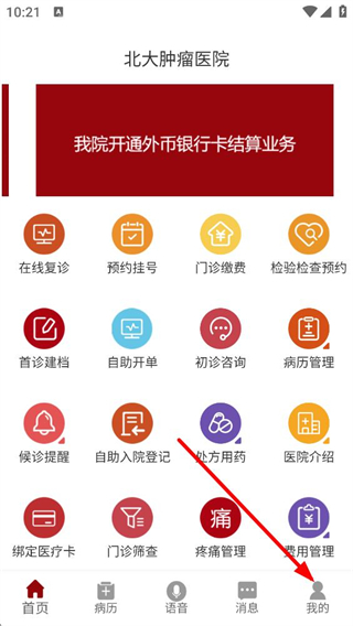 1、進入應用首頁,可見在線復診預約掛號等服務功能,底部設首頁病歷等導航欄,點擊我的按鈕,進入個人中心界面。