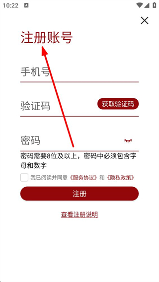 4、點擊注冊帳號進入注冊頁面,填寫手機號獲取驗證碼,設置符合要求的密碼,勾選協議后點擊注冊,完成賬號創建。