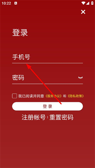 3、進入登錄頁面后,需填寫手機號與密碼,勾選同意相關協議,完成信息填寫后點擊登錄按鈕,嘗試登錄賬號以使用服務。