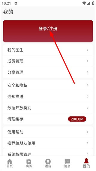 2、在個人中心界面,有我的醫生成員管理等功能選項,上方有登錄、注冊按鈕,點擊該按鈕,進入登錄操作頁面。