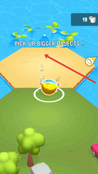 3、然后游戲出現PICKUPBIGGEROBJECTS的提示,角色來到沙灘區域,開始嘗試收集更大的物品,拓展收集范圍。