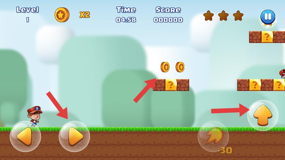3、關卡中操控角色移動,收集金幣,遇到問號方塊,可觸發未知內容,點擊右側向上箭頭按鈕,能讓角色跳躍。