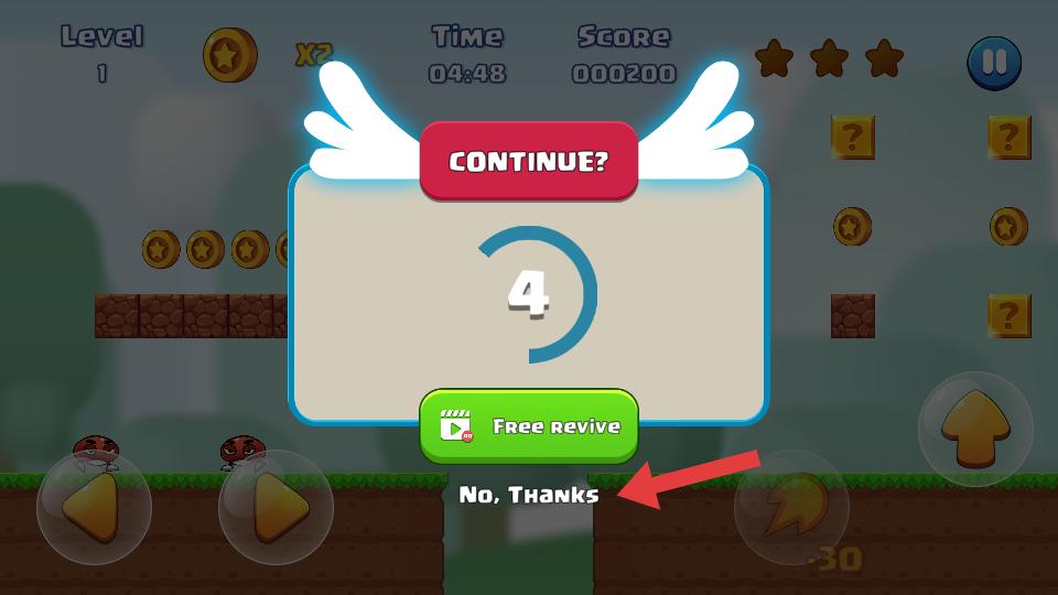 4、若游戲出現CONTINUE提示,可選擇觀看視頻復活,也能點擊No,Thanks,重新開始或退出當前挑戰。