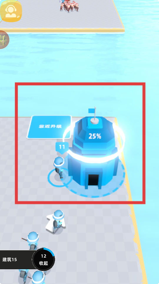1、游戲中看到顯示靠近升級的藍色建筑,讓單位靠近建筑可對建筑進行升級,提升建筑的等級和功能,為后續戰斗等提供助力。