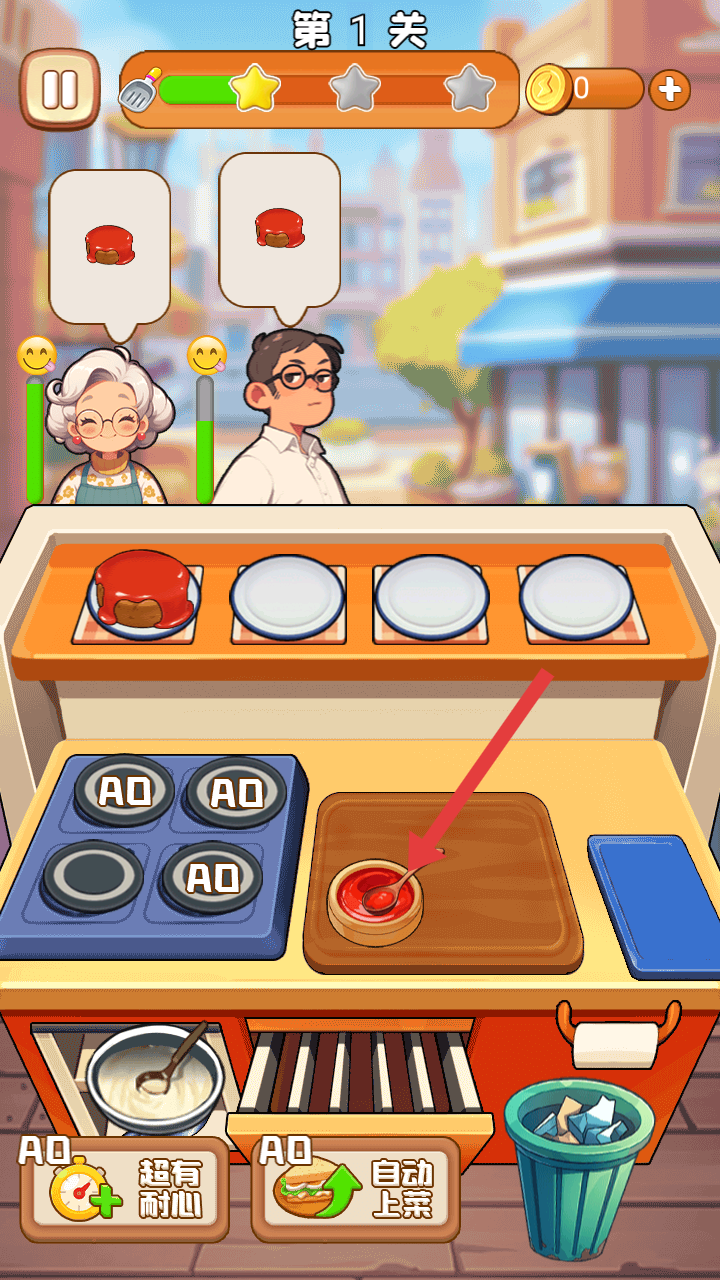 2、第1關小吃攤場景中根據顧客需求,先爐灶上制作基礎食物,等待食物制作完成。