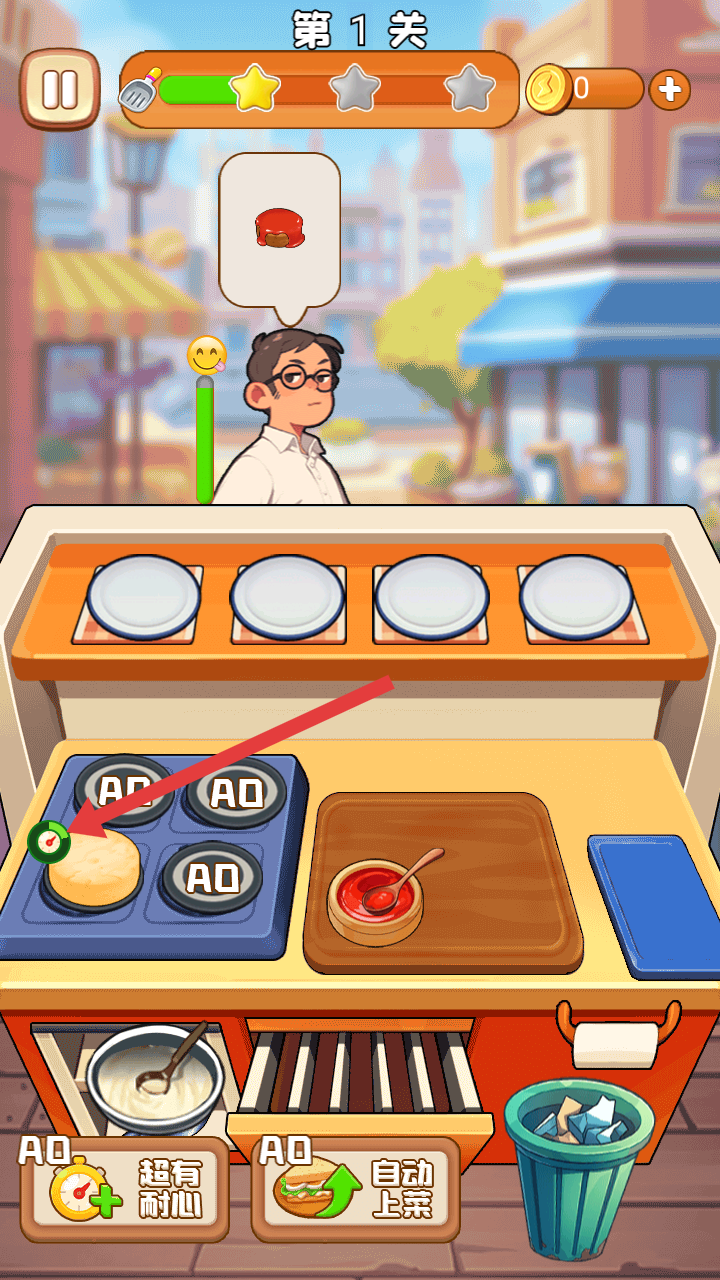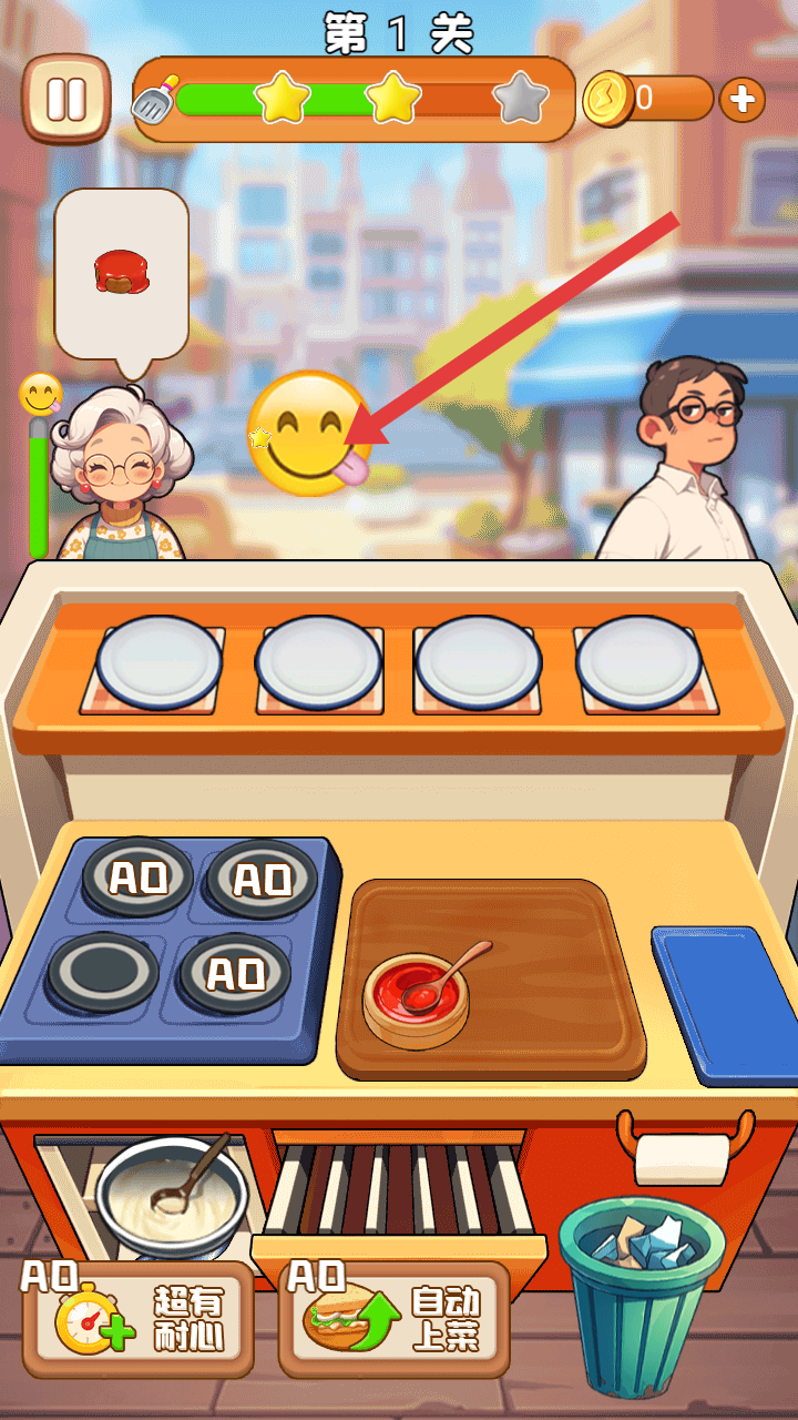 4、將制作好的美食遞給顧客,顧客滿意后會出現笑臉表情,同時能獲得關卡星級評價,推進小吃攤經營進度。