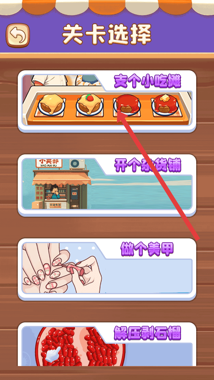 1、進入游戲關卡選擇界面有很多游戲,可選擇支個小吃攤關卡,開啟小吃攤經營之旅。