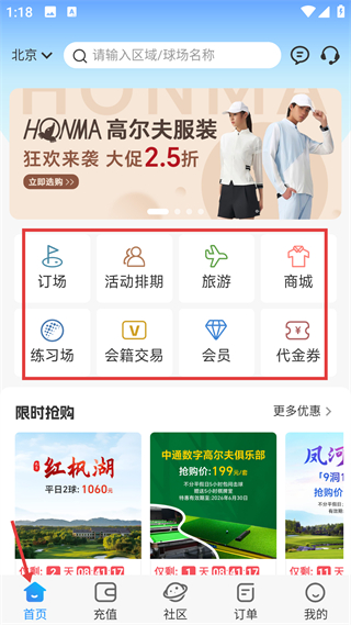 2、首頁集成訂場、活動排期等高爾夫相關功能,展示限時搶購優惠,是高爾夫服務與權益的綜合入口。