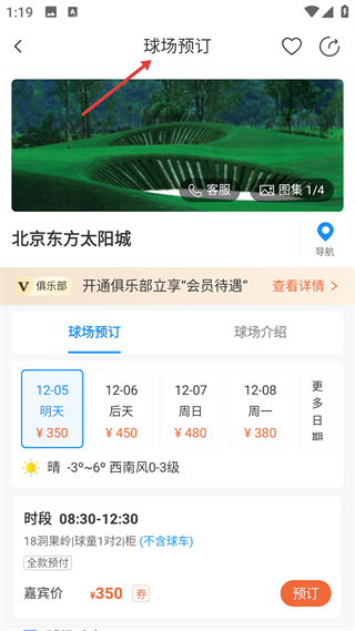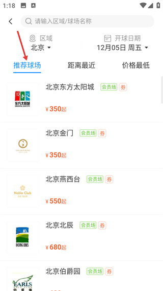 3、訂場頁面支持按區域、日期篩選球場,提供推薦、距離、價格等排序方式,是高爾夫球場的選擇平臺。