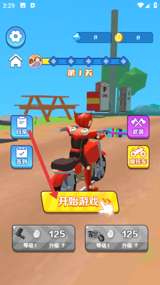 2、進入游戲后,看到帶有開始游戲的按鈕,點擊它開啟摩托車駕駛挑戰,爭取拿到第一名。