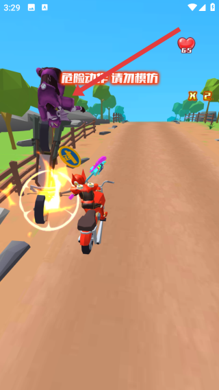 3、駕駛摩托車道路上行駛時,會遇到紫色的敵人角色,需操控摩托車與敵人展開對抗。