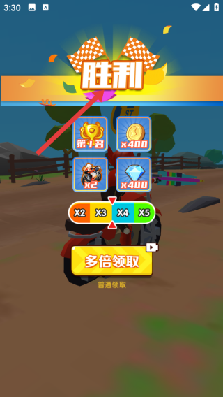 4、成功完成游戲挑戰后,界面會顯示勝利,并給出獎杯、金幣、鉆石等獎勵,可選擇多倍領取或普通領取獎勵。