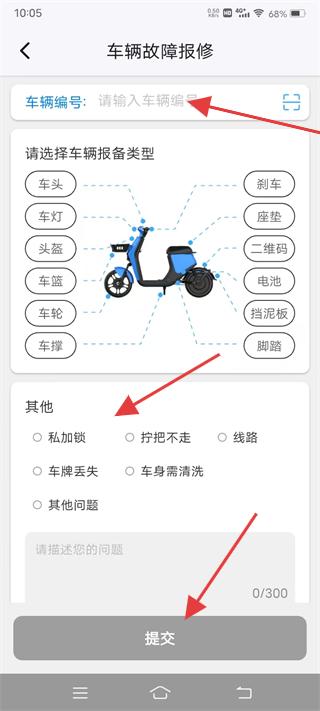 4、進入車輛故障報修頁面輸入車輛編號,選擇車輛報備類型如車頭、車燈等,或其他問題如私加鎖、擰把不走等,描述問題后點擊提交。