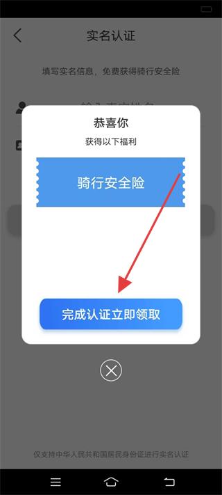 2、進入實名認證頁面點擊完成認證立即領取,可免費獲得騎行安全險,按提示填寫實名信息,完成認證,保障騎行安全與權益。