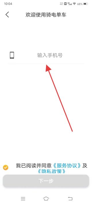 1、打開騎電單車,勾選我已閱讀并同意服務協議輸入手機號點擊下一步,閱讀用車服務協議與隱私策略,確認后點同意。
