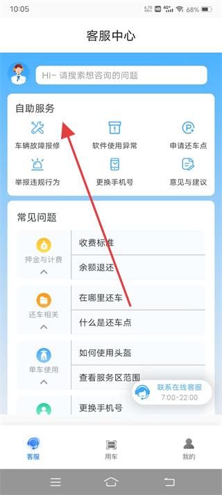 3、進入客服中心查看自助服務的車輛故障報修、軟件使用異常等功能,以及常見問題的收費標準、余額退還等,了解客服服務的模塊。