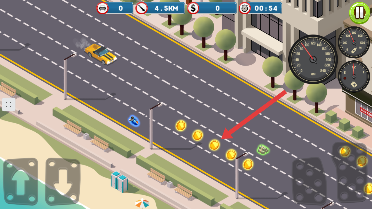 1、進入游戲,操控車輛道路上行駛,路上有金幣,盡量去收集,同時注意上方顯示的剩余距離、時間等信息把握行駛節奏。