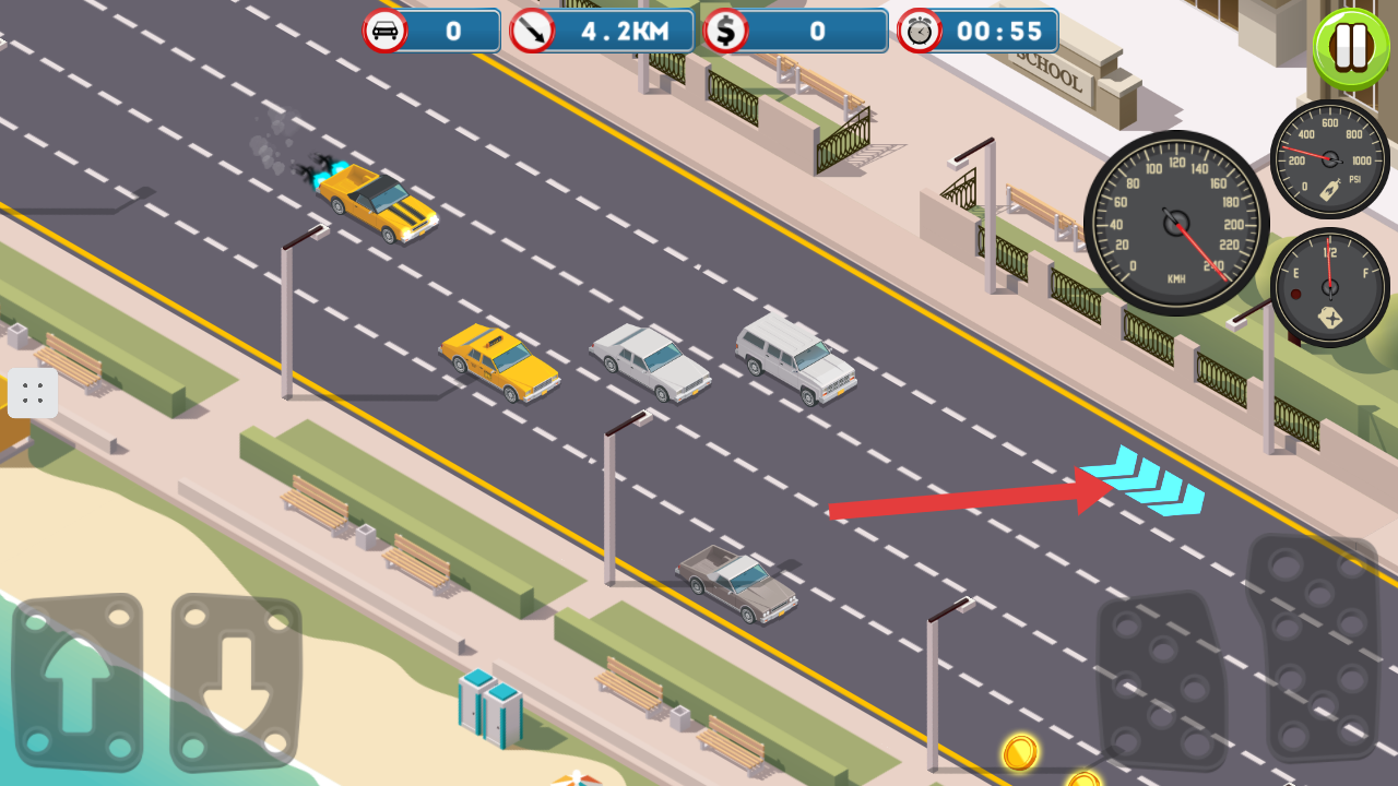 2、行駛中會遇到其他車輛,要靈活避讓還會出現加速箭頭標識,駛到上面能讓車輛獲得加速效果,提升行駛速度。
