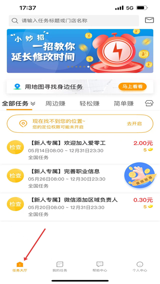 1、任務大廳板塊展示任務分類,有新人專屬任務,可地圖找身邊任務,開啟定位查看附近任務。