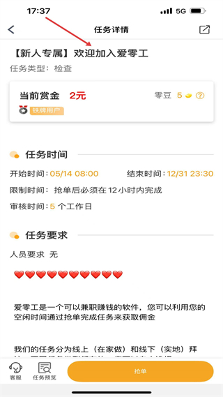 2、新人加入任務賞金2元,時間05.14、12.31,搶單12小時內完成,審核5工作日,介紹愛零工兼職賺錢,任務分線上線下。