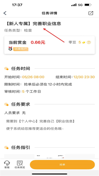 3、完善職業信息任務賞金0.66元,時間05.26、12.30,需個人中心完善信息,搶單12小時內完成,審核5工作日。