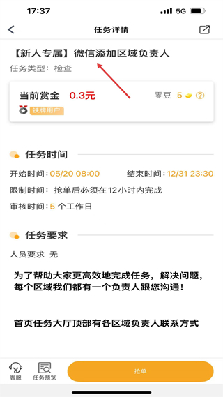 4、添加區域負責人任務賞金0.3元,時間05.20、12.31,需微信添加負責人,搶單12小時內完成,審核5工作日。