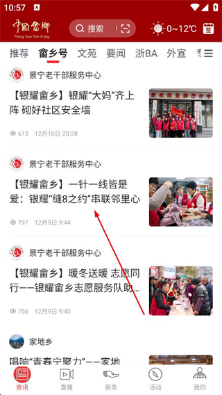 2、登錄后進入首頁瀏覽家鄉號板塊的資訊列表,選擇一針一線皆是愛的資訊,點擊進入該資訊的詳情頁面。