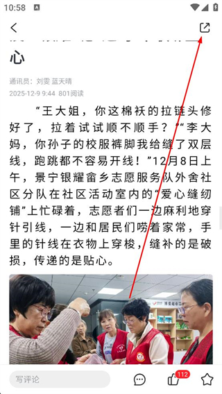 3、在資訊詳情頁面閱讀志愿者縫紉服務的內容,了解此次公益服務的具體情況,點擊上方的分享按鈕。