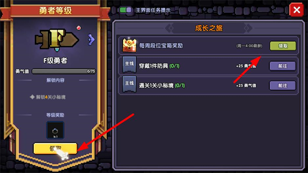 2、可提升勇者等級,完成成長之旅任務,如穿戴防具、通關秘境等,獲取寶箱獎勵和勇氣值。