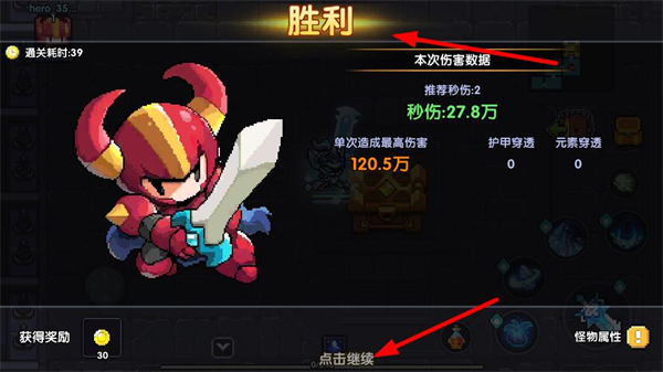 1、戰斗勝利后,可查看通關耗時、傷害數據等,獲得獎勵,點擊繼續進入下一個環節,推進游戲進程。