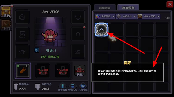 3、在背包里可查看和穿戴裝備,裝備防具能提升戰斗力,盡量收集并穿戴更多更強的防具,增強角色實力。