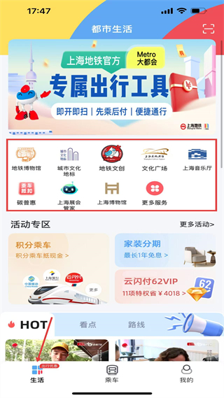 1、生活界面含上海文化廣場等服務入口,是地鐵應用中文化服務與本地生活資源的整合板塊,鏈接文化消費場景。