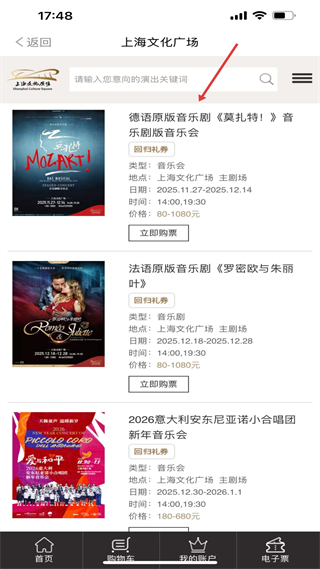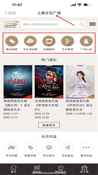 2、上海文化廣場主頁提供演出購票等功能,展示熱門演出信息,是其演出活動的集中展示與服務入口。