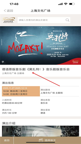 4、演出詳情頁呈現單場演出的時長語言等信息,含演出介紹,是了解細節并選擇場次的頁面。