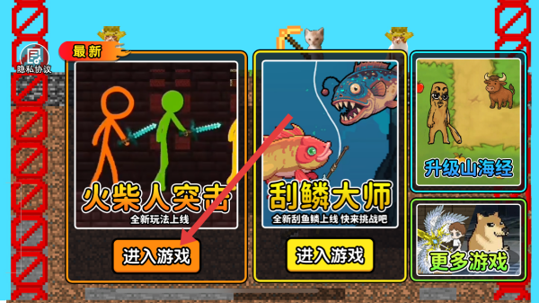 1、進入游戲選擇界面,有火柴人突擊、刮鱗大師等游戲,點擊火柴人突擊下方進入游戲,開啟火柴人冒險。