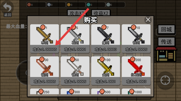 2、武器購買界面,能看到木劍、石劍等不同武器,根據擁有的資源,選擇合適的武器購買,提升攻擊能力。