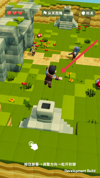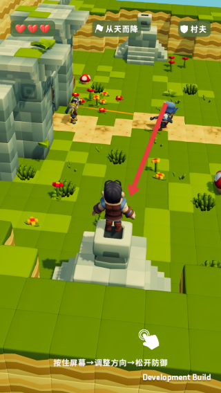 1、進入游戲,按住屏幕調整角色降落方向,松開后角色會朝著目標方向防御性降落,可嘗試降落到合適位置。